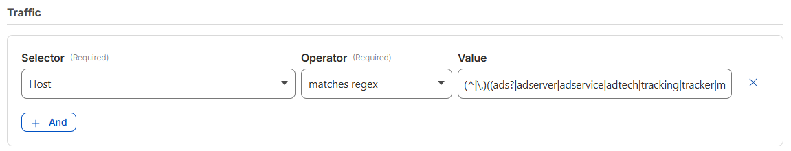 Host matches regex (^|.)((ads?|adserver|adservice|adtech|tracking|tracker|metrics|pixel|beacon)[0-9-]*)(.)