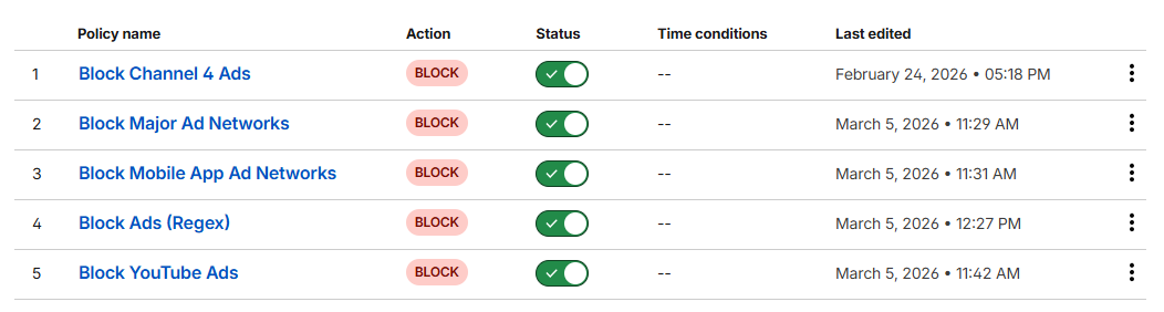 I'll run through the policies I've created to block a very large majority of ads through my networks.